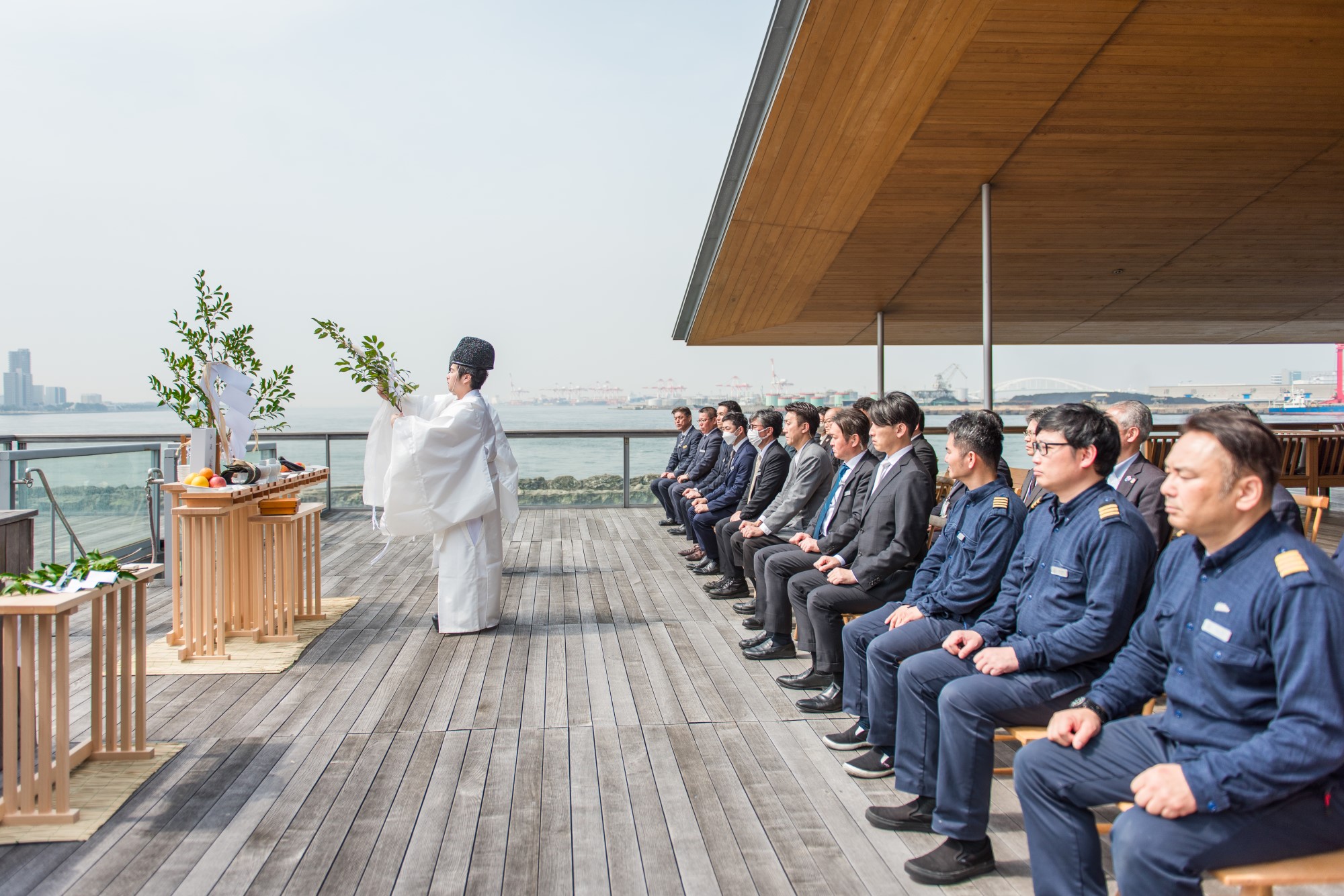 3月24日(月)には8月の特別航路を前に大阪湾内での習熟運航を行い、大阪観光局や大阪港湾局、近畿運輸局など関係者の皆さんとともに、住吉大社権宮司による海上安全のご祈祷を賜りました。